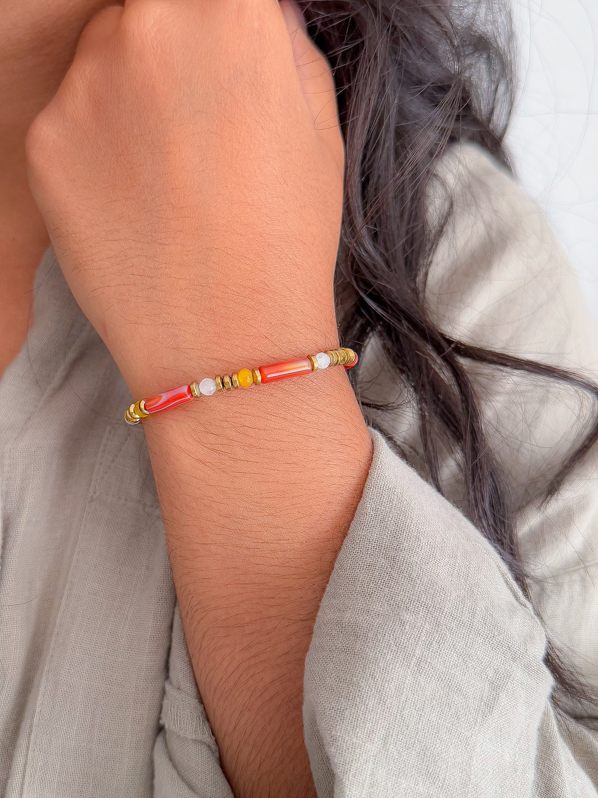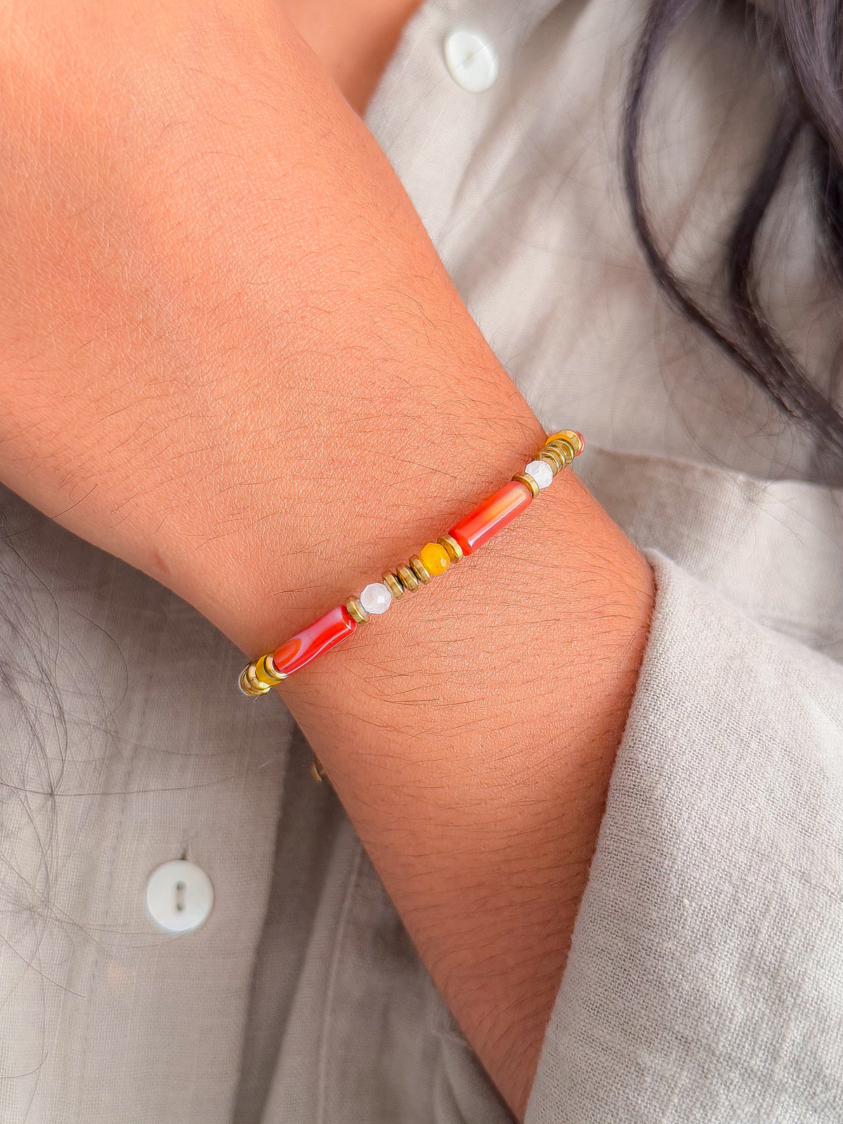 Composé d’Agate orange, d’Agate blanche et de Quartz jaune, il associe trois pierres complémentaires pour soutenir l’énergie vitale tout en apportant apaisement et stabilité.